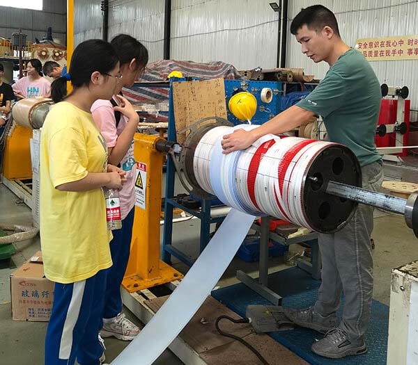 在变压器组装区,组装师傅们耐心地给同学们讲解变压器组装相关的专业知识,并细心地指导同学们动手实践。